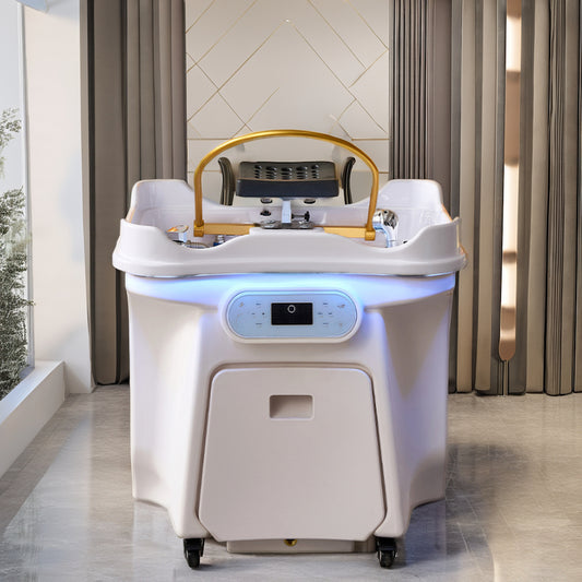 Le bac head spa est une solution compacte sur roulettes, sans raccordement, qui s'intègre dans un salon ou institut existant sans travaux ni cabine dédiée.